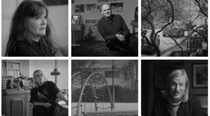 Auður Ava Ólafsdóttir, Hallgrímur Helgason, Oddný Eir Ævarsdóttir and Sverrir Norland appear in the video.