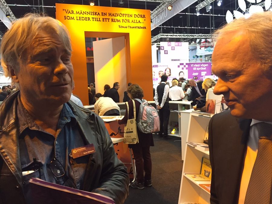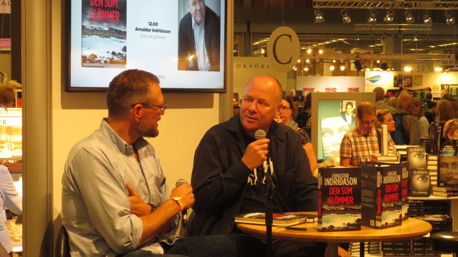 Arnaldur Indriðason spjallar við Henrik Lindvall, sænska útgefanda sinn hjá Norstedts forlaginu í Svíþjóð. |