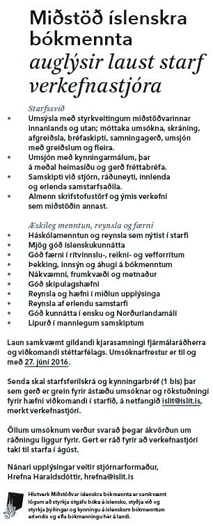 Miðstöð íslenskra bókmennta auglýsir laust starf verkefnastjóra