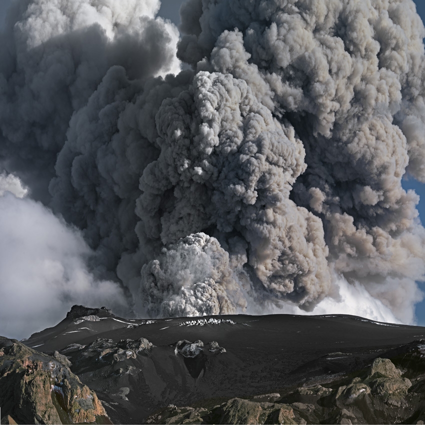 Þetta eru orð að sönnu. Það eru margar feykilega sterkar myndir í kaflanum um öskufallið, hvernig heimurinn undir Eyjafjöllum varð grár í einu vetfangi, myrkur um hábjartan daginn! Forsíðumynd bókarinnar er afar sterk, þar sem eldur logar í tveimur gígum og askan hefur myndað einskonar skál í hálfhring um gíginn. Svo sé ég líka mynd frá þeirra fallegu Seljavallalaug, sundlaug sem var byggð af bændum undir Eyjafjöllum snemma á tuttugustu öld. Myndin er tekin yfir baðhúsið, í suðurátt, laugin sægræn en allt annað öskugrátt, meira að segja himinninn er litaður vægum gráum lit.